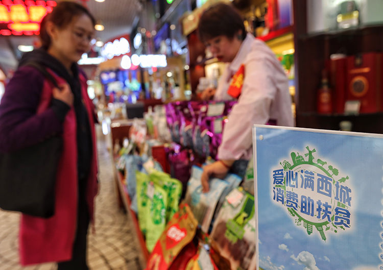 居民正在西单购物中心的消费者扶贫柜台购买农产品。