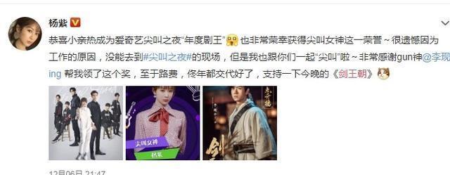 杨紫因为个人工作不能出去,所以她抓住机会赢得了整部戏的奖项。其他人也委托李习安帮助她的好朋友上台领奖。后来,她还在微博上说“任务已经完成”,并借此机会宣传她的新戏。一向很擅长“宣传”的小猴子紫怎么会不明白这个暗示呢?