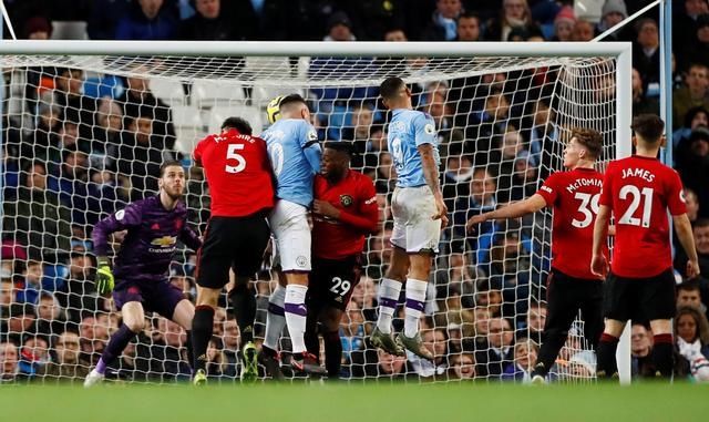 12月7日,曼城球员奥塔门迪(左三)在比赛中回家。当天,曼联在2019-2020赛季英超第16轮比赛中以2-1客场击败曼城。