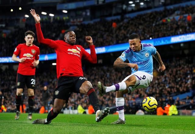 12月7日,曼城球员耶酥(右)在比赛中与曼联球员比萨(中)竞争。