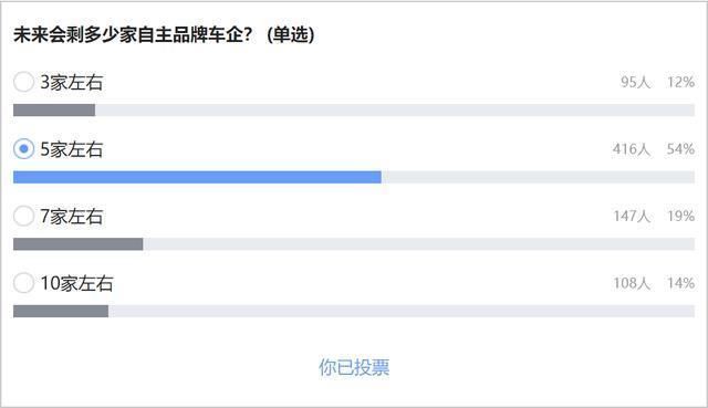 在网民看来,大多数人认为未来会有大约5家独立品牌汽车公司。前一段时间,作者写了一篇关于独立品牌销量的文章,问网友有多少独立品牌会留在后续。从答案来看,他们大多数选择了5。
