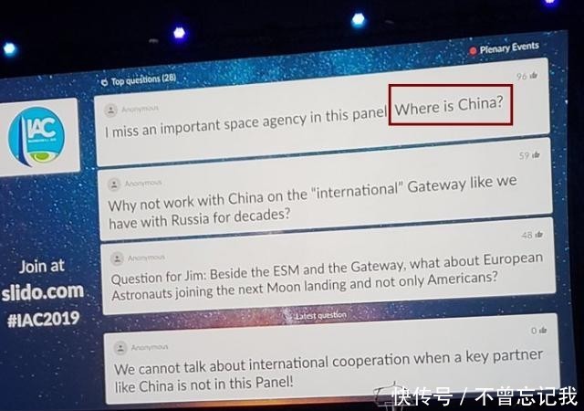 她透露,今年7月,也就是会议前三个月,中国向美国提交了一份参加国际宇航联合会大会的初步人员名单。中国国家航天局代表团前往美国,对此,1000多名观众感到难以置信,他们用手机问道:“在这次会议上,我错过了一个重要的航天局。中国国家航天局去哪里了?”这个问题出现在会议厅的大屏幕上,引起了国际社会的广泛关注。