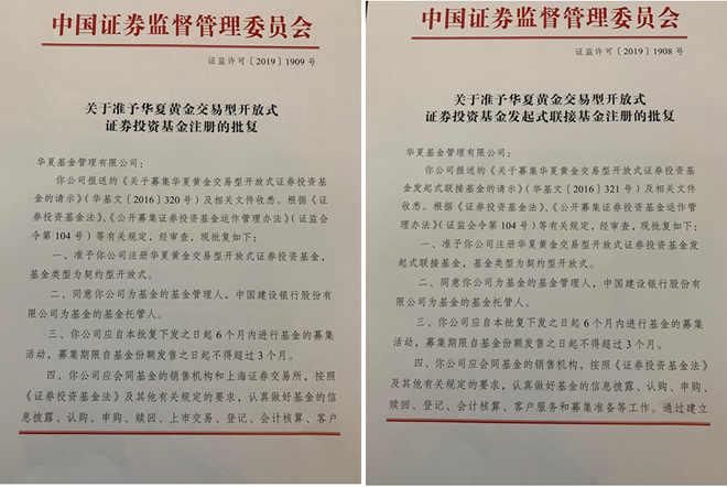 金融基金10月22日讯——今天,华夏黄金交易所交易基金(Huaxia Gold ETF)和华夏黄金交易所交易基金链接(Huaxia Gold ETF Link)等许多黄金交易所交易基金已经获得批准,为商品交易所交易基金增加了新成员。这也是华夏基金继中国豆粕饲料期货交易所交易基金之后的第二只大宗商品交易所交易基金(审批见下图)。