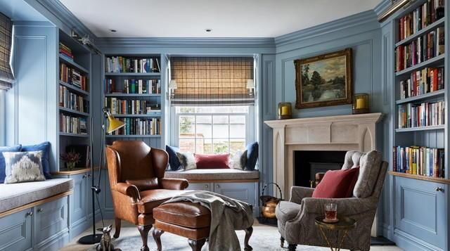 经典舒适设施,如稳定豪华的椅子、落地书柜和舒适豪华的面料。