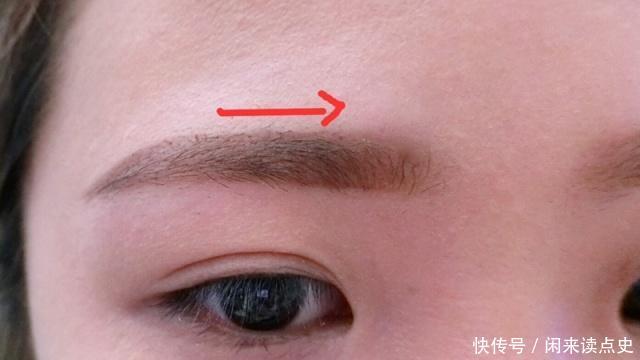 然后我们需要蘸上眉粉,按箭头指示的方向刷,这样眉毛末端最深的眉毛就会微微发晕。