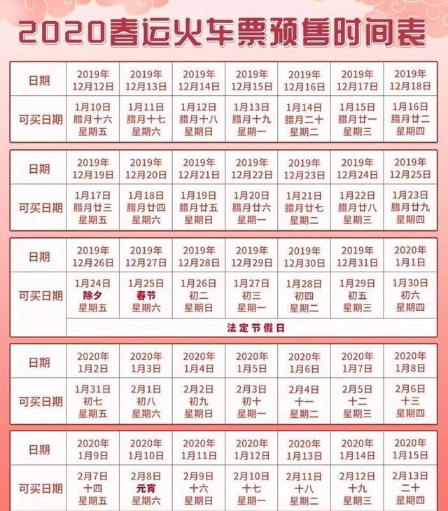 铁路春运火车票按网上电话订票提前30天,车站售票窗口和网点提前28天的规定办理。春节的第一天将在2020年1月10日。乘客可以在12月12日购买春节第一天的火车票。