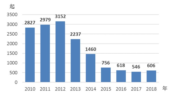 2.在打击针对儿童的犯罪方面已经取得了重大成果。为了加强对儿童的保护,预防和打击拐卖儿童犯罪,我国利用“互联网加反拐”的新模式,不断完善公安部失踪儿童信息紧急发布平台,取得了良好的法律和社会效果。在过去两年中,该平台发布了3000多条关于失踪儿童的信息,并找回了3300多名儿童。近年来,随着中国《打击人口贩运行动计划》(2013-2020年)的深化,贩运儿童罪明显下降。2018年,全国共破获606起贩运儿童案件,比2015年下降19.8%,比2010年下降78.6%(见图8)。