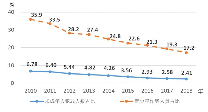 4.青少年犯罪的比例继续下降。我国少年犯和少年犯的比例继续下降(见图9)。2018年,全国少年犯人数为34,000人,与上年基本持平,比2010年减少34,000人,即49.6%。同期少年犯人数占罪犯总数的2.41%,比上年下降0.17个百分点,比2010年下降4.37个百分点。年轻罪犯占所有罪犯的17.2%,比上年下降2.1个百分点,比2010年下降18.7个百分点。