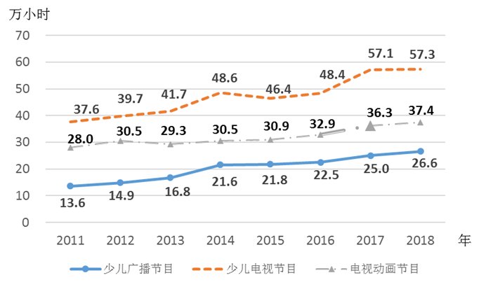 3.儿童文化产品和场所日益丰富。2018年,中国共出版儿童图书44,000种,出版儿童图书8.9亿册,分别比上年增长4.1%和8.4%。全国共有公共图书馆3176家,公共图书馆儿童文学藏书1.14658亿册,比上年分别增长0.3%和14.7%。全国儿童广播节目、儿童电视节目和电视动画节目的播出时间分别为26.6万小时、57.3万小时和37.4万小时,比上年分别增长6.4%、0.4%和3.2%(见图7)。全国参观博物馆和科技馆的未成年人数量分别为2.6966亿人和3446万人。