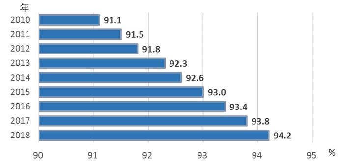 2.义务教育的普及程度继续提高。2018年,全国九年义务教育巩固率达到94.2%,比上年增长0.4个百分点,继续接近《纲要》的“95%”目标(见图3)。小学适龄儿童净入学率达到99.95%,比上年增长0.04个百分点。[初中毛入学率为100.9%,九年制义务教育人口覆盖率达到100%。