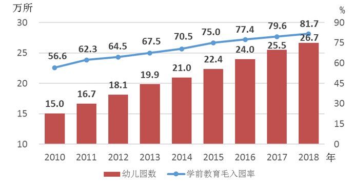 1.学前教育发展水平稳步提高。2018年,党中央、国务院发布了《关于深化学前教育改革和规范发展的若干意见》,进一步推动了我国学前教育的改革和发展。2018年,学前教育占国家财政教育经费的4.8%,比上年增长0.2个百分点。全国有267,000所幼儿园(见图2),包括101,000所公立幼儿园和166,000所私立幼儿园,分别比上年增长4.6%、6.7%和3.4%。城乡公立幼儿园分别为19,000所和82,000所,比上年分别增长5.4%和7%。全国专职幼儿园教师258.1万人,幼儿园(含幼儿园和附属班)学龄前儿童4656.4万人,比上年分别增长6.1%和1.2%。全国学前教育毛入学率为81.7%,比上年提高2.1个百分点,自2014年实现《纲要》的“70%”目标以来,毛入学率持续上升。
