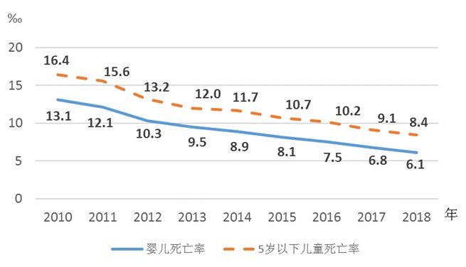 1.儿童健康水平不断提高。自2010年以来,婴儿死亡率和5岁以下儿童死亡率持续下降(见图1)。2018年,全国婴儿死亡率为6.1‰,五岁以下儿童死亡率为8.4‰,均比上年下降0.7‰,明显低于纲要10‰和13‰的目标。儿童健康水平的不断提高在延长我国预期寿命方面发挥了重要作用。《中国妇幼保健发展报告》(2019年)显示,2000年至2015年中国预期寿命增长了4.9年,其中23.5%是由于5岁以下儿童死亡率下降。