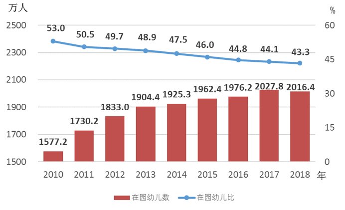 自2010年以来,中国公立幼儿园规模稳步扩大。2018年,国有幼儿园(包括附属幼儿园)有1,660.4万名儿童,比2015年增长2.8%,比2010年增长27.9%。尽管公立幼儿园的儿童人数逐年上升,但这一比例却在逐年下降(见图11)。