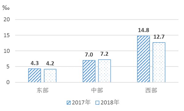 自2013年以来,全国婴儿死亡率和五岁以下儿童死亡率已经达到《纲要》的目标,但城乡和地区之间的差距仍然很大。2018年,全国城市婴儿死亡率为3.6‰,农村为7.3‰,是城市的两倍多。5岁以下儿童死亡率城市为4.4‰,农村为10.2‰,是城市的1.3倍。5岁以下儿童的死亡率在不同地区之间也有很大差异,西部地区的死亡率是东部地区的两倍(见图10)。
