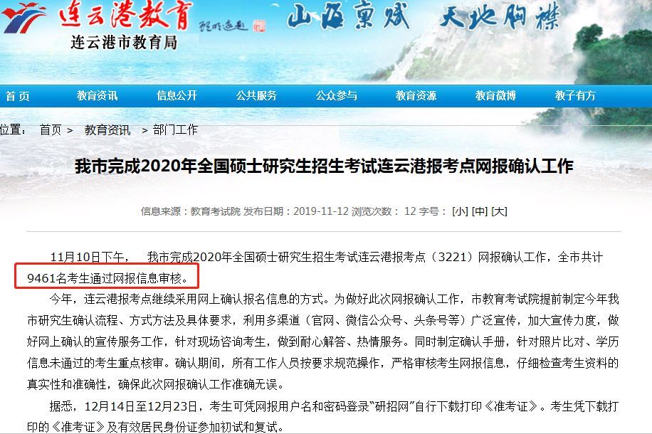 11月10日下午,连云港市在连云港入境点(3221)完成了2020年全国研究生入学考试网上确认。全市共有9461名考生通过了网上信息考试。