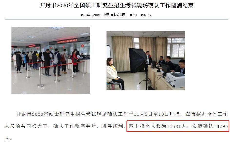 开封2020年研究生入学考试网上报名人数为14581人,实际确认人数为13795人。