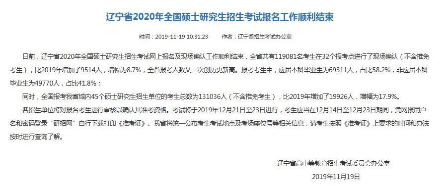 据统计,辽宁省共有119,081名考生在32个报名点(不包括已获豁免的考生)得到现场确认,比2019年增加9,514人,增幅8.7%。辽宁省的候选人数再次创下历史新高。候选人中,69311人(58.2%)为应届毕业生,49770人(41.8%)为非应届毕业生。