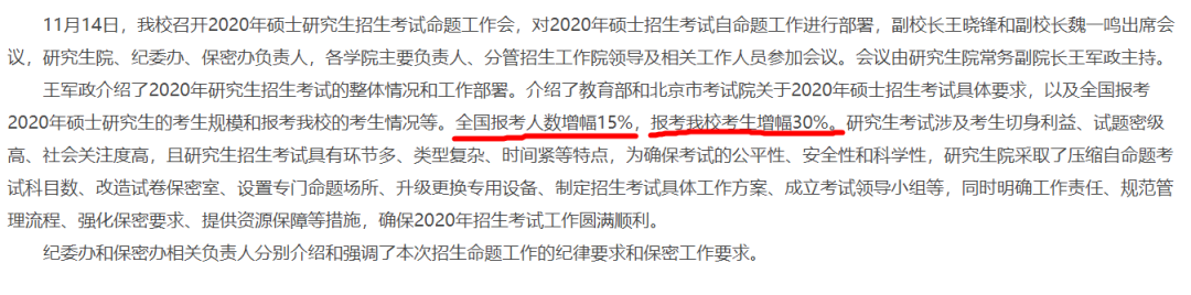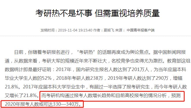 在11月初《中国青年报》发表的一篇文章中,“研究生入学考试热不是坏事,但应该注意培训质量”,指出“研究生入学考试机构通过对申请人数增长趋势和大学申请人现状的分析,预测到2020年申请人数可能达到330万至340万人。”