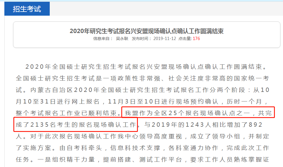 兴安联赛作为该地区25个报名站点确认点之一,已经完成了2135名考生的报名站点确认。这比2019年的1243人多了892人。