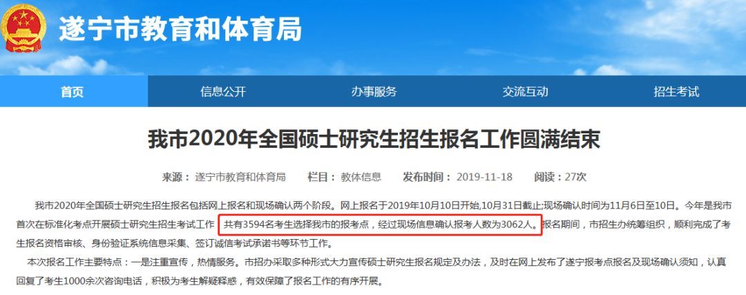 今年是遂宁市首次在标准化考点开展研究生入学考试。共有3594名考生选择了遂宁市的考点,现场信息确认的考生人数为3062人。