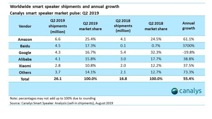 各种迹象表明,中国智能扬声器市场正在迎来自己的辉煌时刻。根据知名市场研究机构CAN ALYS发布的《2019年Q2全球智能扬声器出货报告》,2019年第二季度小型智能扬声器的出货量达到450万台,全球排名超过谷歌,成为继亚马逊之后的第二个全球智能扬声器品牌,刷新了中国智能扬声器季度出货量的排名。
