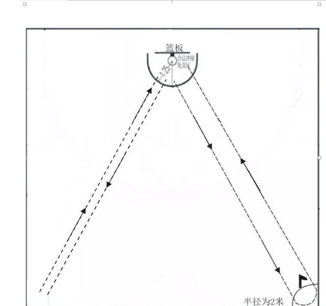 考生从篮球场中心线与边线的交叉处开始计时,运球并上篮抢篮板球,运球通过法定碰撞豁免区,运球到另一边边线的中点,绕过标记,转身,运球并再次上篮,运球到击球后的起点或弥补篮板球的缺失,停止计时并在秒内记录测试结果,每人可以测试两次以获得最佳分数。