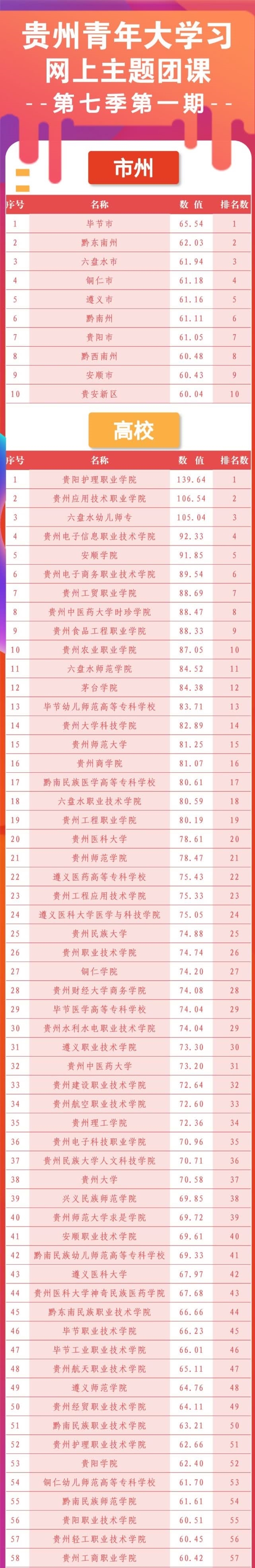 在第七季第一期的“青年学习”中,贵阳护理职业学院整体排名第一。贵州应用技术职业学院、六盘水幼儿师范学院、贵州电子信息技术职业学院和安顺大学紧随其后,值得其他高校学习。贵州电子商务职业技术学院、贵州工贸职业学院、贵州中医药大学时珍学院、贵州食品工程职业学院和贵州农业职业学院名列前十。