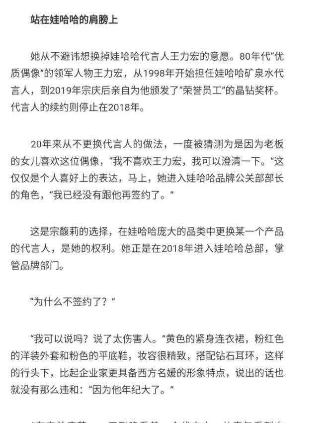 她从未回避更换发言人王力宏的愿望。网民曾猜测,宗馥莉喜欢王力宏,因为她已经20年没有换发言人了。然而,宗馥莉在采访中澄清说,她并不是真正的王力可·力宏。她没有签王力宏的原因是因为王力宏年纪大了,人们厌倦了美学。从青年到中年,从中年到老年,看一个发言人并不有趣。从旧到新,变化是她的改革方向和目标!
