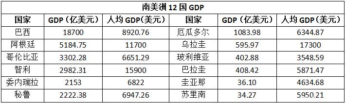 12个南美国家的国内生产总值总和是广东的2.5倍,人均国内生产总值约为中国人均国内生产总值的90%。