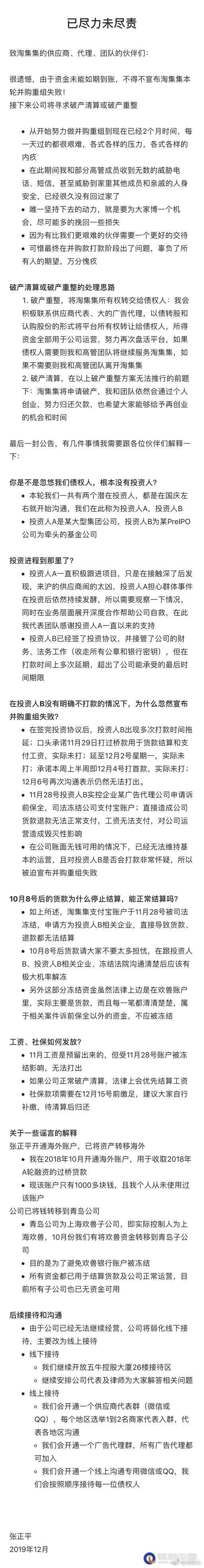 张正平在公开信中表示,破产重组是将淘大收藏的所有权转移给债权人:他将联系供应商和大型广告代理机构的代表,以债转股和股份认购的形式将平台所有权转移给债权人。所有获得的资金将用于公司运营,并将努力再次振兴该平台。如果债权人需要,他和高级管理团队将继续为淘大收藏服务,如果不需要,他和高级管理团队将离开淘大收藏。破产清算是指上述破产重组计划无法实施的前提:冀涛·吉将申请破产,他和他的团队仍将努力通过个人创业偿还债务。
