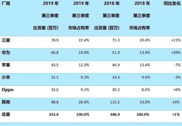 根据Canalys在2019年第三季度发布的全球智能手机出货量排名,三星电子同比增长11%,出货量达到7890万部,市场份额为22.4%。然而,与华为29%的增长率相比,三星电子完全有危机感。
