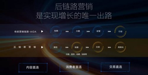 “后链营销”打破了传统营销环节中“知识-兴趣-欲望-行动”的逻辑,将营销链的后端放在关注转型的线索和交易等环节的前面,在非常短的营销路径内创造出“展示-线索-交易-再转型”的后链营销,并通过内容、消费者和交易的直接联系来关注转型。