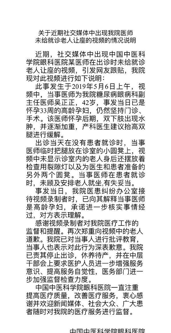 然而,中国中医研究院眼科医院表示,有关医生在看病人时不照顾老人的座位是不适当的。医院说它在视频中向老人郑重道歉。
