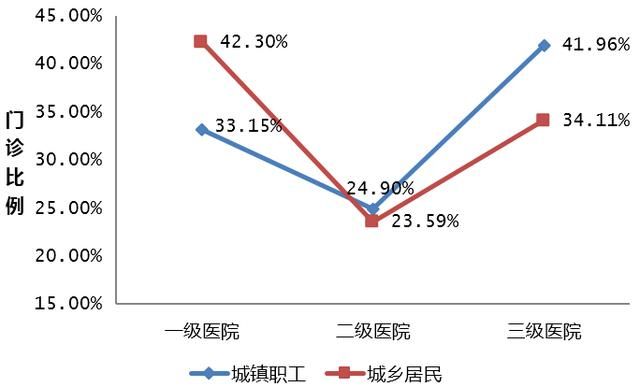 首先,城镇职工和城乡居民基本医疗保险门诊报销比例的差异导致了患者医疗选择的差异。城镇职工基本医疗保险的缴费标准和筹资水平高于城乡居民,各级医院的报销率明显高于城乡居民。我国城镇职工基本医疗保险的报销标准与被保险人所在医院的水平相关联,但就小病或常见病而言,不同的报销率造成的被保险人门诊缴费金额差异实际上并不大。因此,城市工人倾向于选择三级医院进行医疗。一是达到报销限额,二是追求更好的医疗服务。此外,为了引导参保患者寻求合理的医疗,避免盲目就诊于主要城市医院,城乡居民基本医疗保险实行普通门诊统筹。鼓励参保居民到门诊统筹协议管理的基层医疗卫生机构就医,基层医疗卫生机构实行低免赔额高比例报销政策。随着医院水平的提高,可扣除额增加,比例降低,从而达到医疗保险对患者就医的导向作用。