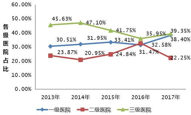 图2城乡居民医疗保险参保患者医疗选择年度变化图第三,根据2013-2017年门诊患者的选择,城乡居民基本医疗保险参保患者选择一级医院的概率较高,城镇职工基本医疗保险参保患者更有可能选择三级医院,二级医院的比例普遍较低。