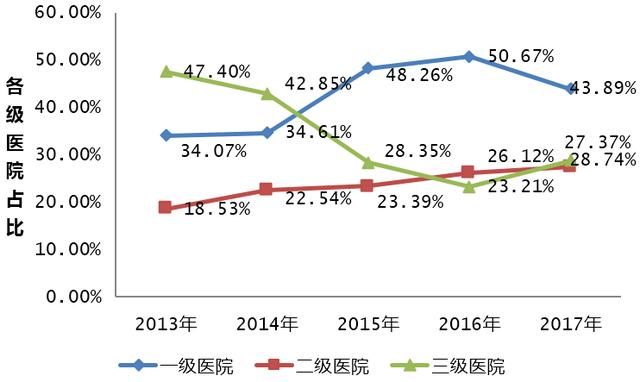 第二,城乡居民基本医疗保险制度的整合,使到基层医院就诊的参保患者比例发生了重大变化。2015年至2016年,城乡居民基本医疗保险制度一体化的实践在全国范围内得到推广。新型农村合作医疗逐步与城镇居民基本医疗保险相融合,大量农村居民被纳入城乡居民基本养老保险制度。由于农村居民的基层就医习惯和相对偏远的地理位置,城乡居民基本医疗保险制度整合以来,城乡居民医疗保险患者就医流向发生明显变化,选择一流医院就医的比例大幅提高。