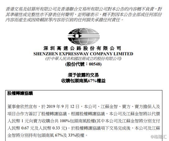 昨日晚间,深圳高速公路宣布,已于当日与卖方、卖方担保人和项目合作伙伴江苏金枝签署股权转让协议,以1元人民币的价格向卖方购买包头南丰全部股权,其中深圳高速公路支付0.67元人民币,江苏金枝支付0.33元人民币。交易完成后,深圳高速公路和江苏金枝将分别持有包头南丰67%和33%的股份。