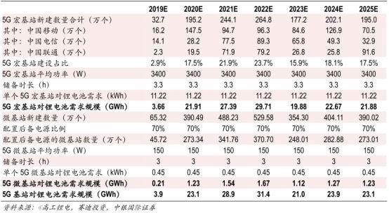 数据:4G基站改为5G功率,需要同步增加备用电池容量。通常,备用电源需要储存3-4小时的电力。据估计,5G建设将在2019-2025年期间带来155.4千兆瓦时的锂电池需求增量。