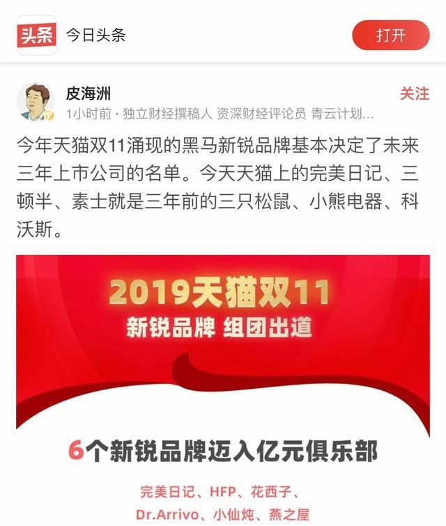 对此,金融专家皮海舟表示:“今年天猫双十一中出现的黑马品牌和新品牌基本上决定了未来三年上市公司的名单”。