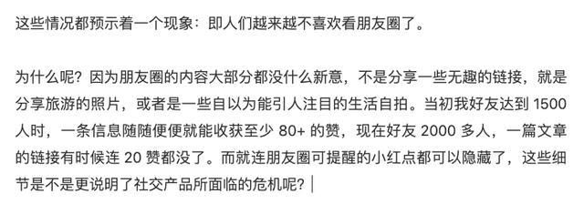 开始时,我说过社会模式每天都在变化,社会产品一个接一个地涌现出来。毕竟,人与人之间的交流变得复杂了。微信最初的想法是与熟人社交。虽然“附近的人”和“晃动”的功能很受欢迎,但人们并没有真正理解这些功能的概念,只是简单地说他们没有通过它们来发挥作用。现在不同了。有各种各样的产品。有些应用是我的朋友安利。让我看看里面的互动。真的,读完之后,我刷新了我的世界观。因此,在这个时代的背景下,微信的“三天可见性”功能更像是处理复杂社交互动的减法。根本原因是朋友数量的增加加剧了自相矛盾的心理。你怎么说?继续往下看。