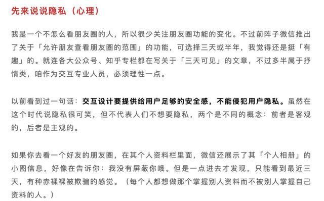 “隐私”的功能一直在优化,产品不断提高用户所谓的安全感,这只是告诉一些人现代社会没有隐私,表现出两个极端。但事实上,这也很合适,因为没有隐私,人们更关心隐私。微信朋友圈能