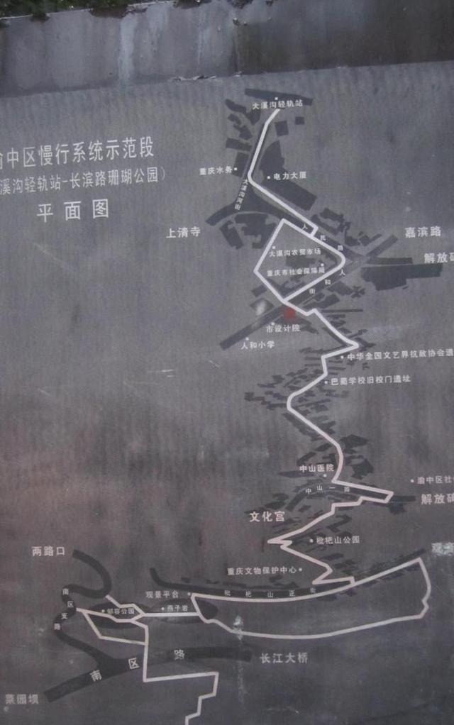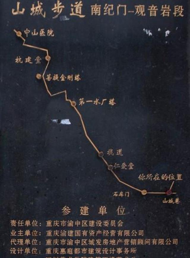 这是山城人行道的示意图。请注意:我从图的底部走到了顶部:中山医院,巴蜀学校的旧址,中华全国抗日协会...一步一步来。