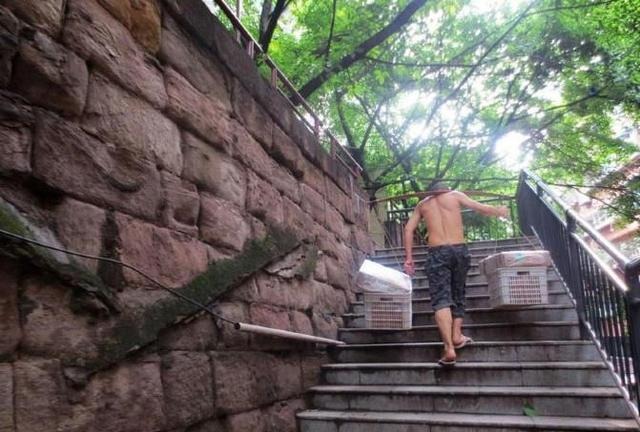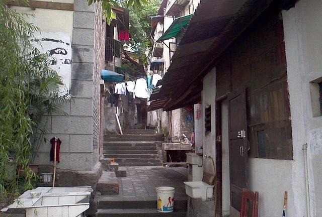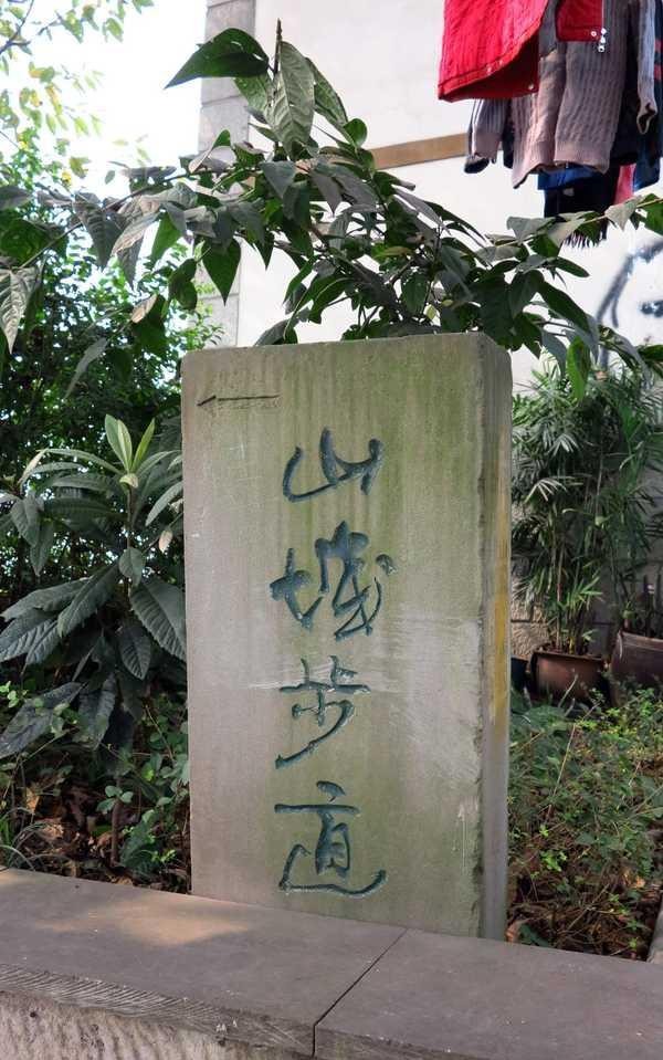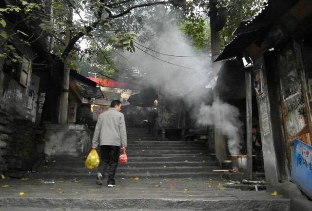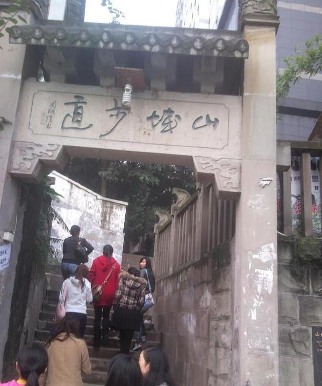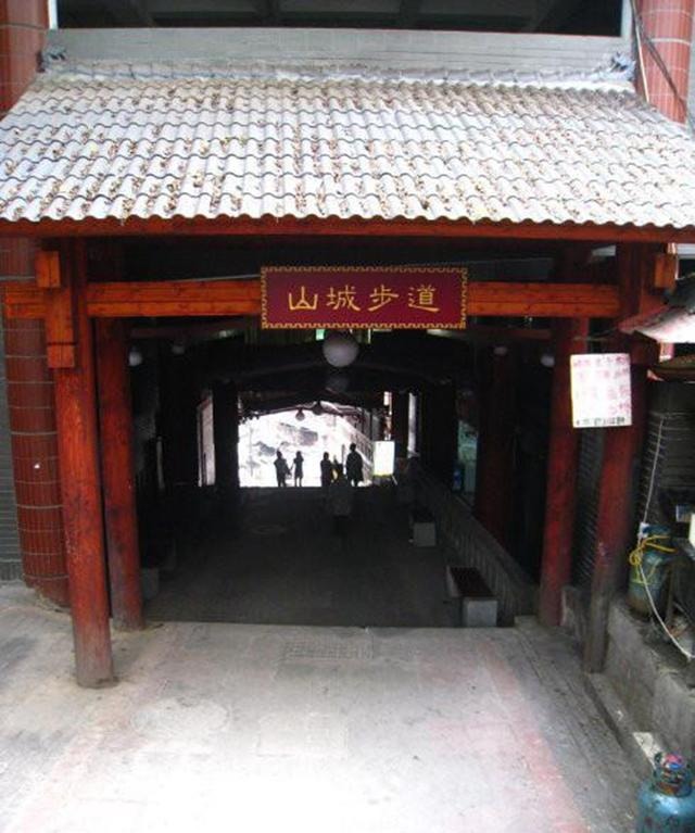 在向交警询问了这条路之后,我穿过了几条路,继续前行——很快就到达了重庆中山医院。在它旁边,确实有一个小的街道入口,上面有一条木制走廊。门楣上写着“山城小道”。站在山城小径的入口处,向下望去,我只看到一排笔直通向深处的长石阶。石阶上的步行者也变得非常小...