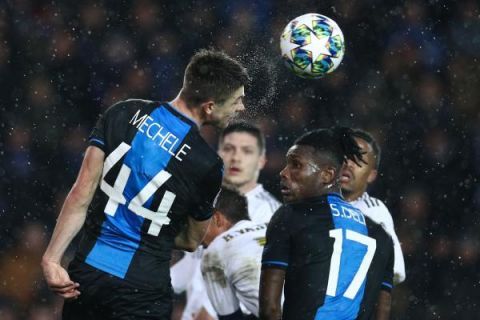 12月11日,布鲁日球员米歇尔(左起)在比赛中头球摆渡。