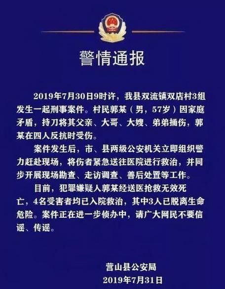 8月1日,英山警方发出警告通知,称7月30日9点左右,英山县双流镇栓店村3组发生一起刑事案件。村民郭某因家庭冲突用刀刺伤了父亲、大哥、大嫂和弟弟。郭某在四人反叛时受伤。