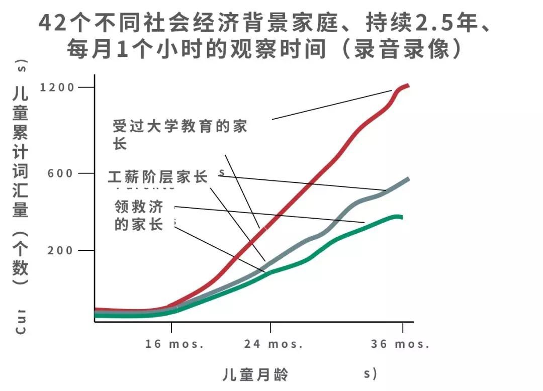 \r\r 有一项美国研究。它分为三类家庭。在16个月大的时候,孩子之间没有区别,但是到了3岁,受过大学教育的父母的词汇量是1200。工薪阶层的父母、高中生和蓝领学生有600个词汇。然而,领取粮票的家庭的词汇量超过300个,但不到400个。\r
