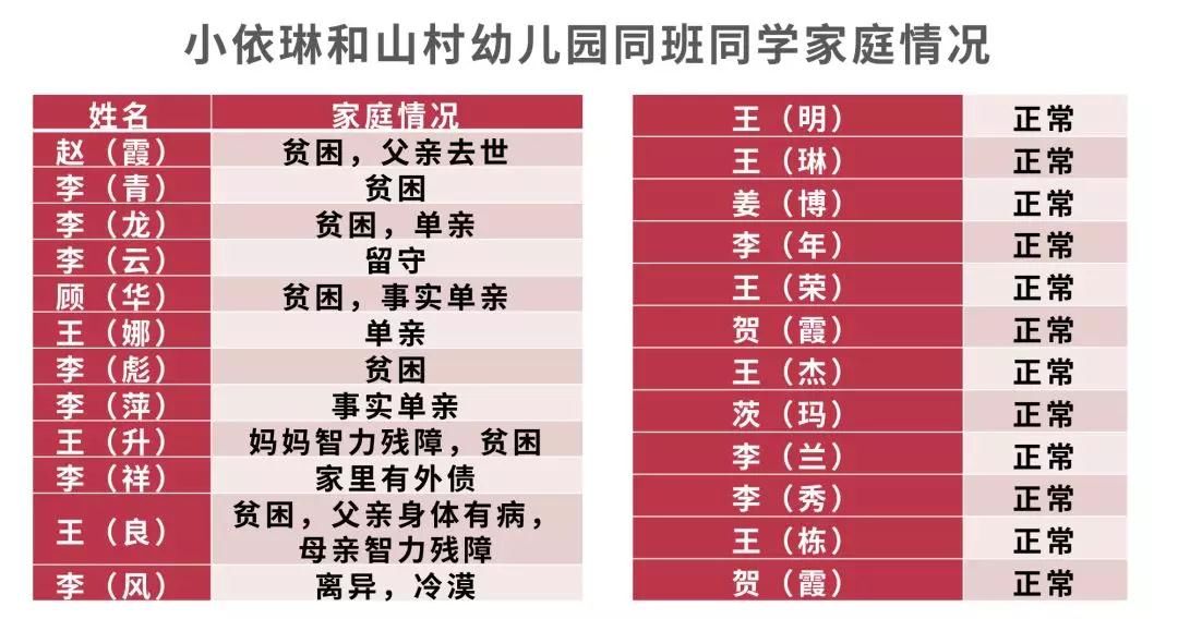 \r 当时王一林的幼儿园同学情况如何?这个班的25名儿童中,有13名家庭状况不佳,如贫困、双住、单亲、母亲精神残疾等。这几乎是农村地区的总体情况。其他12个孩子的家庭关系正常,但他们也有低教育水平和低收入。\r