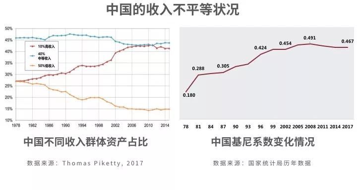 \r\r 左边是皮凯蒂制作的关于财产不公平分配的图表。红线是高收入群体,他们的财产正在迅速增加。右边的图表是基尼系数,它表明了收入分配的公平性。\r