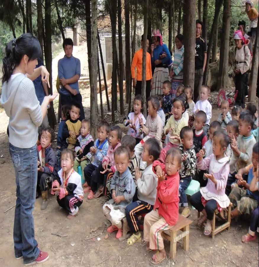 \r\r 我们开始使用这种教学方法,我们尝试过各种场合。这是云南省寻甸县。老师正在树荫下教孩子们。\r