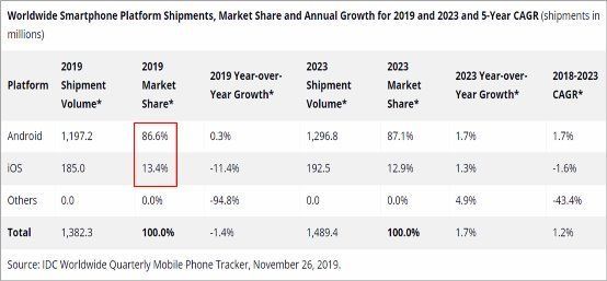 和往常一样,苹果的旗舰机器定于每年秋季发布,因此第一部5G苹果手机预计将于2020年9月发布,比安卓阵营的5G手机晚了一年多。IDC在对安卓和iOS阵营市场影响力的对比分析中也指出,安卓手机的份额将从2018年的85.5%上升到2019年的86.6%,主要是由于5G的引入和中国制造商产品组合的扩大。